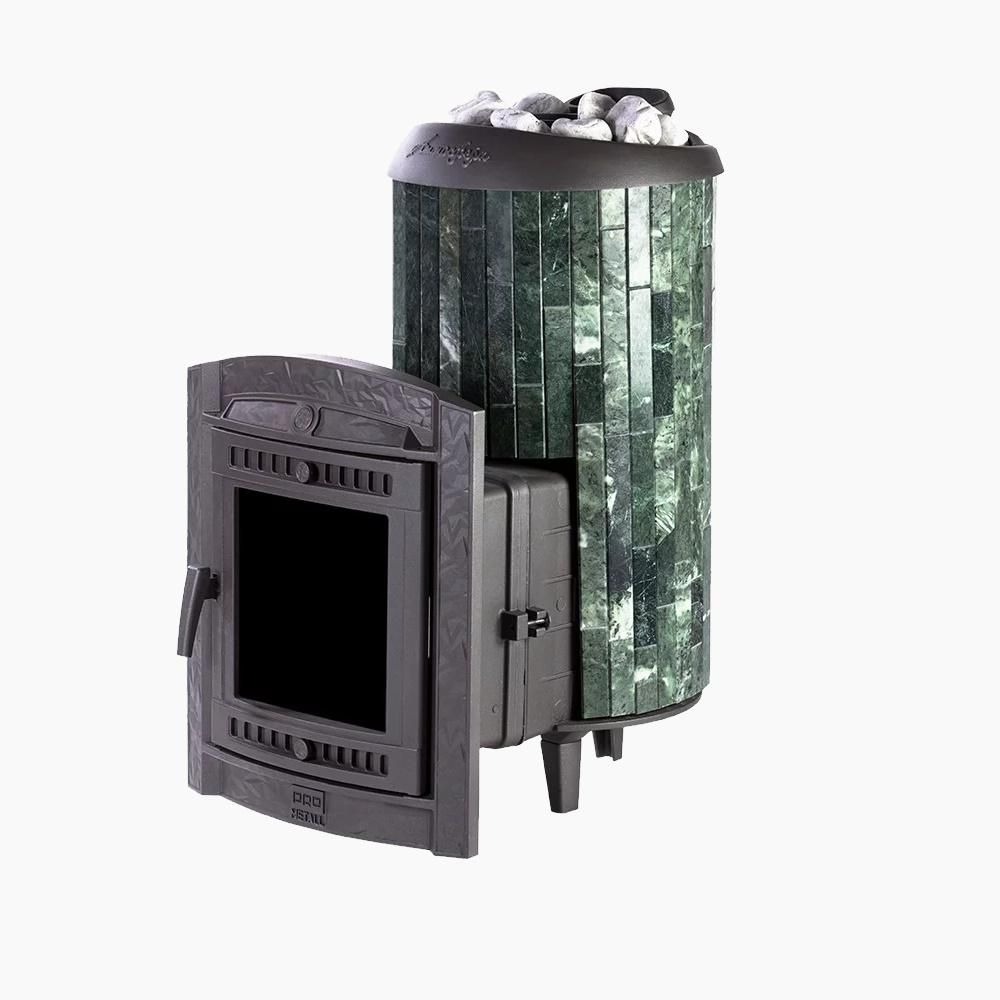 Практичная и компактная модель. Ламели по периметру внешней каменки не только обладают хорошими теплонакопительными свойствами, но и придают печи оригинальный внешний вид.