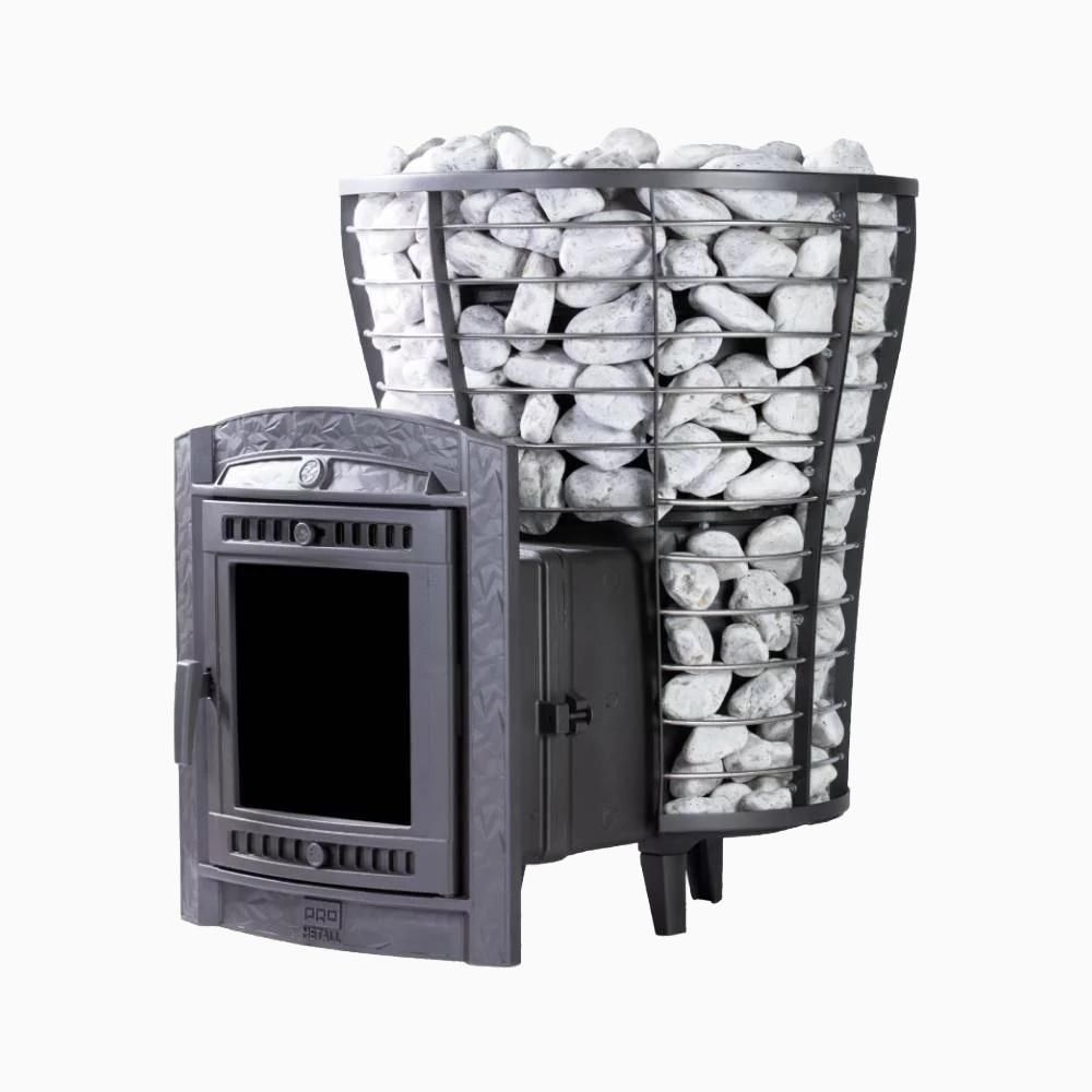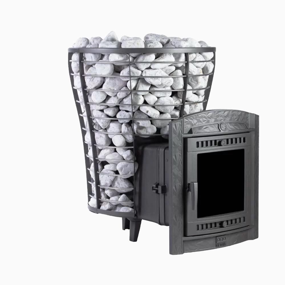 Модель повышенной мощности, обеспечит максимальное количество пара в больших помещениях. Кожух печи изготовлен в виде сетки из нержавеющей стали с прямоугольными ячейками и полностью заполняется природными камнями, обеспечивая высокую динамику нагрева парильного помещения.